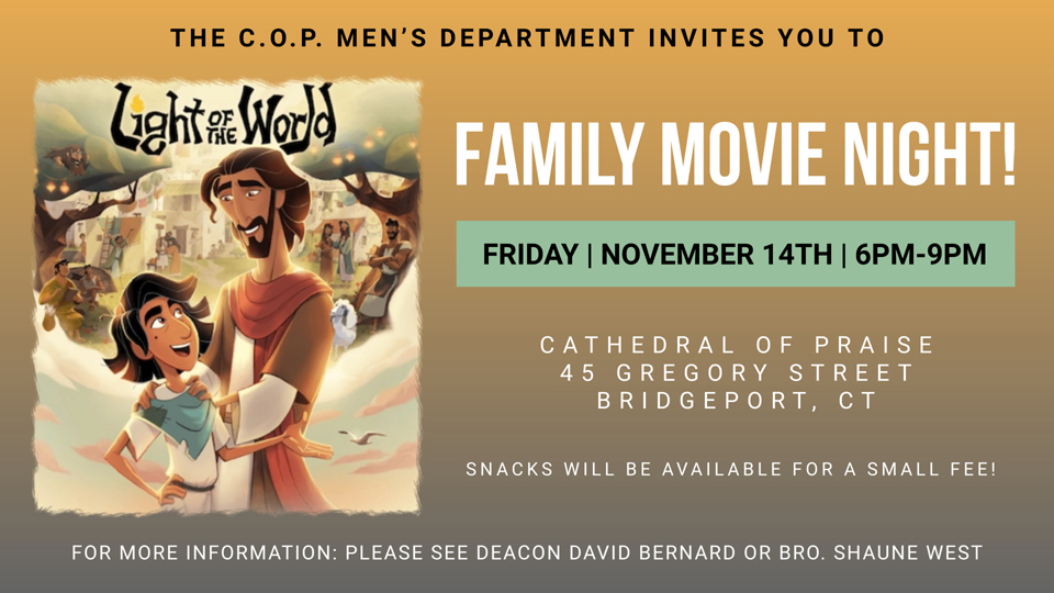 Join us at C.O.P. for FAMILY MOVIE NIGHT as we watch the animated movie, “Light of the World.” Refreshments will be available for a small fee.