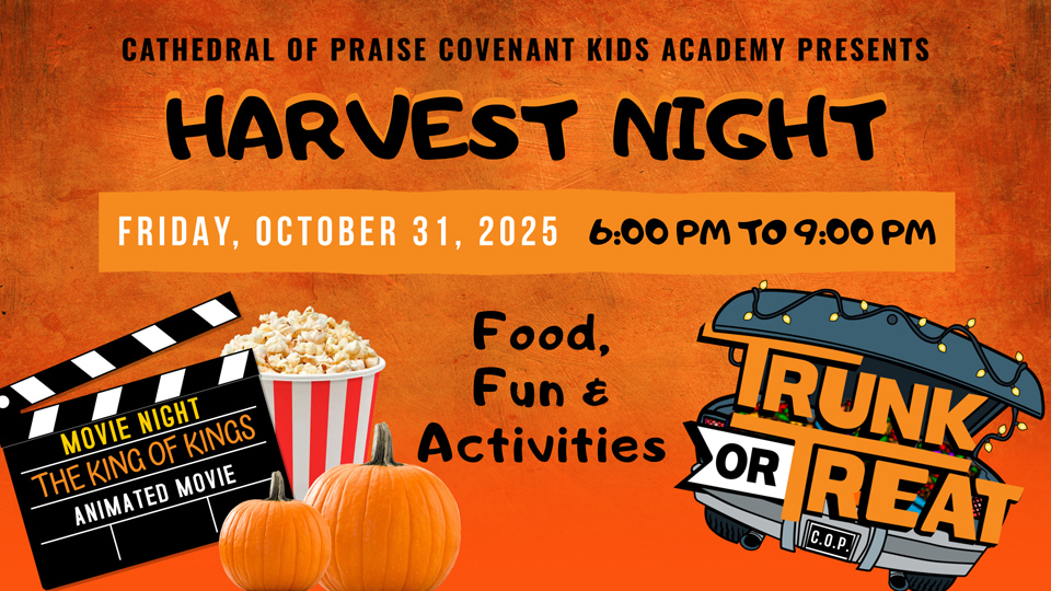 The Covenant Kids Academy is sponsoring HARVEST NIGHT on Friday, October 31st from 6:00 to 9:00 PM! This will be a night of food, fun and activities. There will be a showing of the animated Christian movie, "King of Kings" and will feature "Trunk or Treat" with goodies for the children! VOLUNTEERS & DONATIONS OF...
