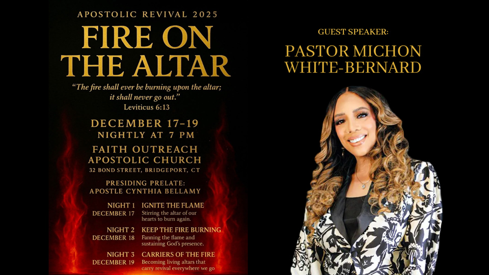 Pastor Michon will be the special guest speaker for a 3-Night Apostolic Revival on Wednesday, December 17th through Friday, December 19th at Faith Outreach Apostolic Church, 32 Bond St. in Bridgeport, CT. All are welcome to come out and support our pastor!